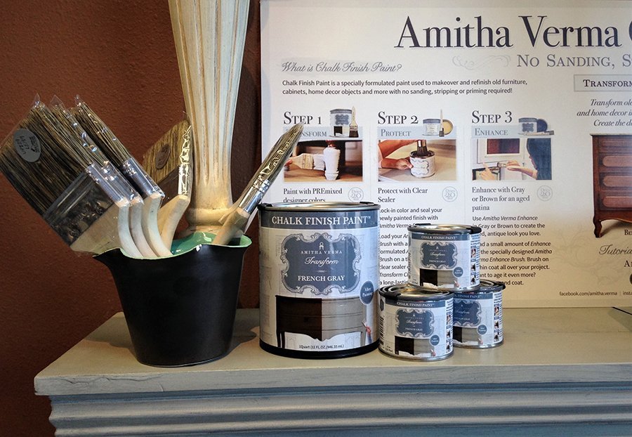 Amitha Verma Chalk Finish Furniture Paint can quickly and easily transform old, ordinary furniture (even if you think it’s junky) into a stunning painted masterpiece. Give your furniture an unbelievable makeover with Amitha Verma Furniture Paint. We carry all 12 paint colors, the clear sealer and the two colors of antiquing wax, plus boars hair brushes for the application of each of the 3 steps.